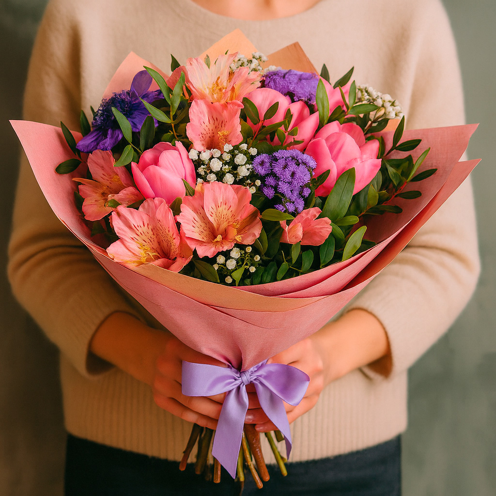 Яркие розовые тюльпаны и альстромерии в сочетании с синим анемоном и фиолетовым агератумом создают удивительную палитру. Гипсофила и фисташка добавляют воздушности и свежести. Букет перевязан нежной сиреневой лентой и оформлен в матовую пленку с крафт-бумагой. Альтернативное оформление: атласная лента или декоративная сетка. Прекрасный подарок для любимой на 8 марта.