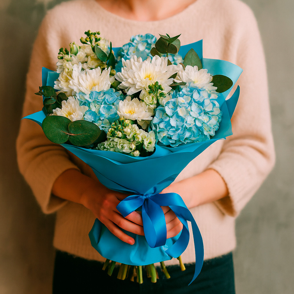 Голубая гортензия, белоснежные хризантемы и маттиола сочетаются с эвкалиптом, создавая атмосферу прохлады и нежности. Букет оформлен в матовую плёнку голубого цвета и перевязан атласной лентой. Альтернативой может быть крафт-бумага или декоративная сетка. Прекрасный выбор для поздравления на день рождения или для любимой.