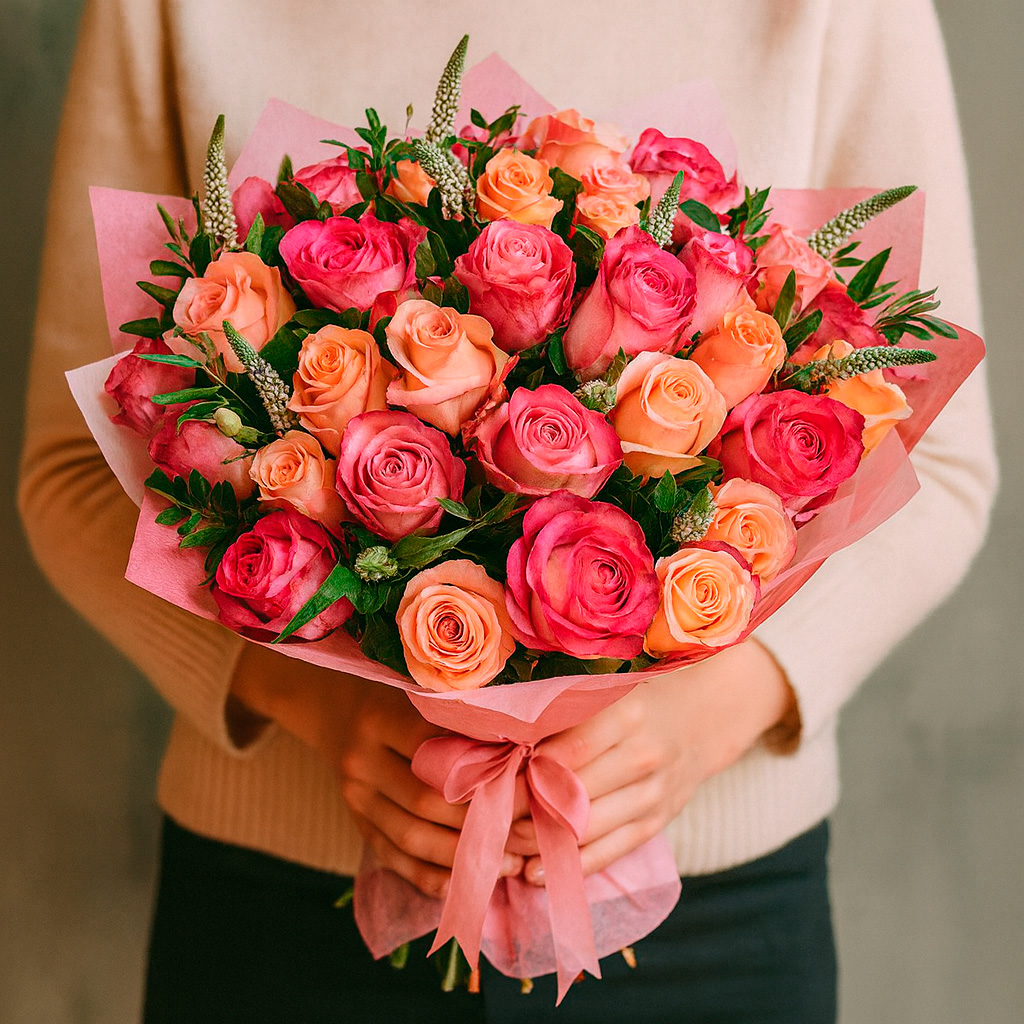 Роскошный букет из розовых и кремовых роз, дополненный белой вероникой, создаёт атмосферу нежности и утончённости. Оформлен в матовую плёнку и перевязан атласной лентой, он выглядит особенно элегантно. Возможны альтернативы оформления: крафт-бумага или декоративная сетка. Прекрасный выбор для подарка на годовщину или для любимой.