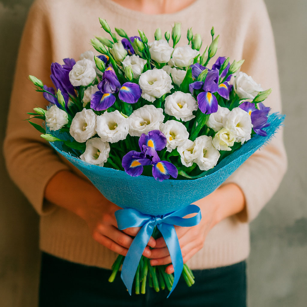 Белоснежные лизиантусы и фиолетовые ирисы создают гармоничное сочетание, подчёркнутое свежей зеленью. Букет оформлен в голубую сетку и перевязан атласной лентой. Возможна упаковка в прозрачную плёнку или крафт-бумагу. Прекрасный подарок для любимой на годовщину или день рождения.