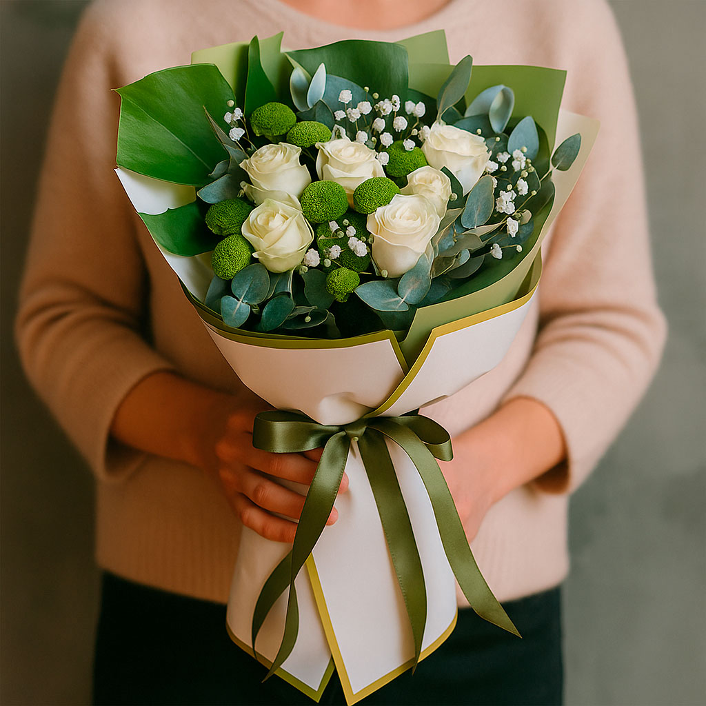 Белые розы и зеленые хризантемы создают гармоничное сочетание с монстерой и эвкалиптом, дополняемое гипсофилой и лунарией. Упакован в матовую пленку с элегантной лентой. Альтернативно можно оформить в крафт-бумагу или декоративную сетку. Прекрасный выбор для подарка на годовщину или для любимой.