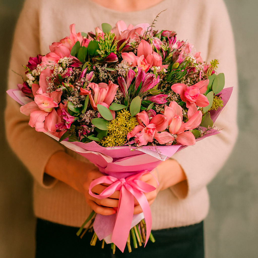 Розовые орхидеи и альстромерии создают нежное сочетание, дополненное лимониумом и зеленью. Букет оформлен в матовую пленку с атласной лентой, подчеркивающей его элегантность. Возможна упаковка в крафт-бумагу или декоративную сетку. Прекрасный выбор для любимой на день рождения.