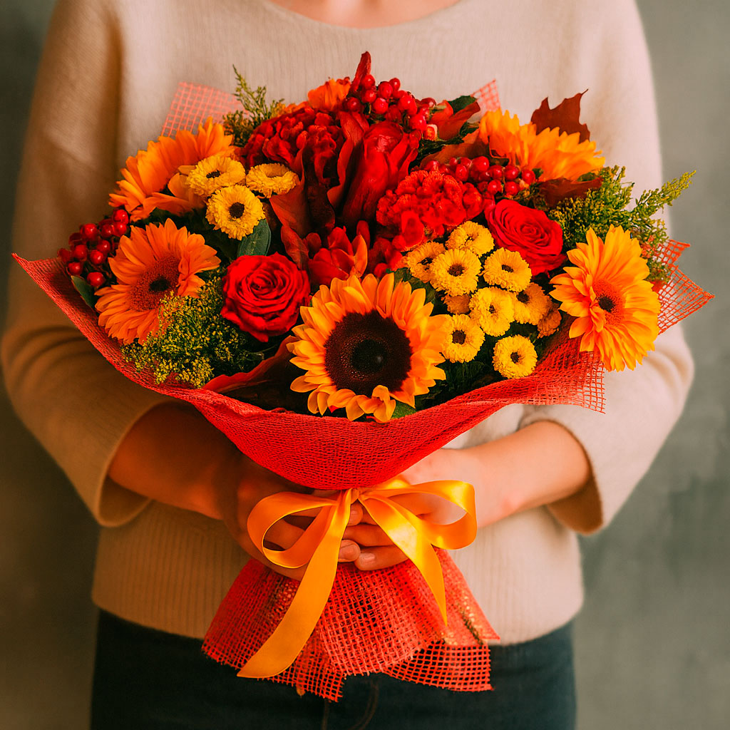 Яркие подсолнухи, красные розы и жёлтые герберы создают жизнерадостную композицию, дополненную мини-хризантемами и гипперикумом. Букет оформлен в красную декоративную сетку и перевязан жёлтой атласной лентой. Возможны альтернативы оформления: матовая плёнка или крафт-бумага. Прекрасный подарок для жены на годовщину или для мамы на день рождения.