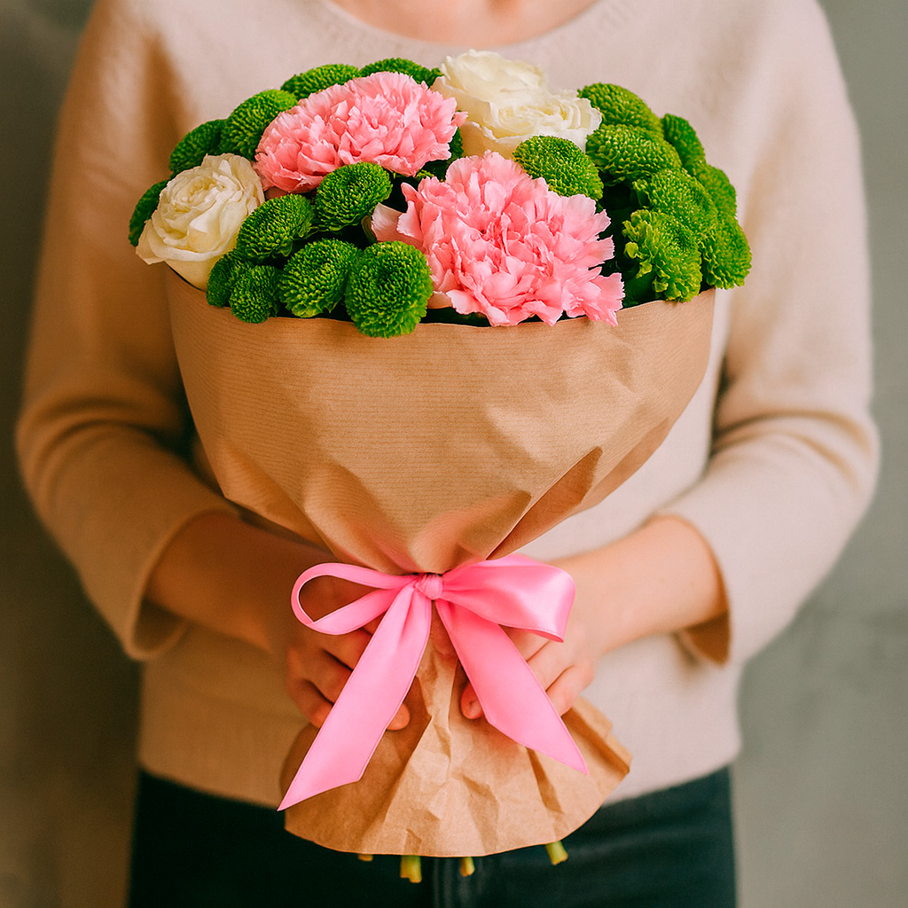 Яркие розовые гвоздики, белоснежные розы и зеленые кустовые хризантемы создают гармоничное сочетание в этом букете. Упакован в крафт-бумагу и перевязан розовой атласной лентой, он выглядит стильно и элегантно. Возможны альтернативы оформления с матовой плёнкой или декоративной сеткой. Прекрасный подарок для любимой на день рождения или 8 марта.