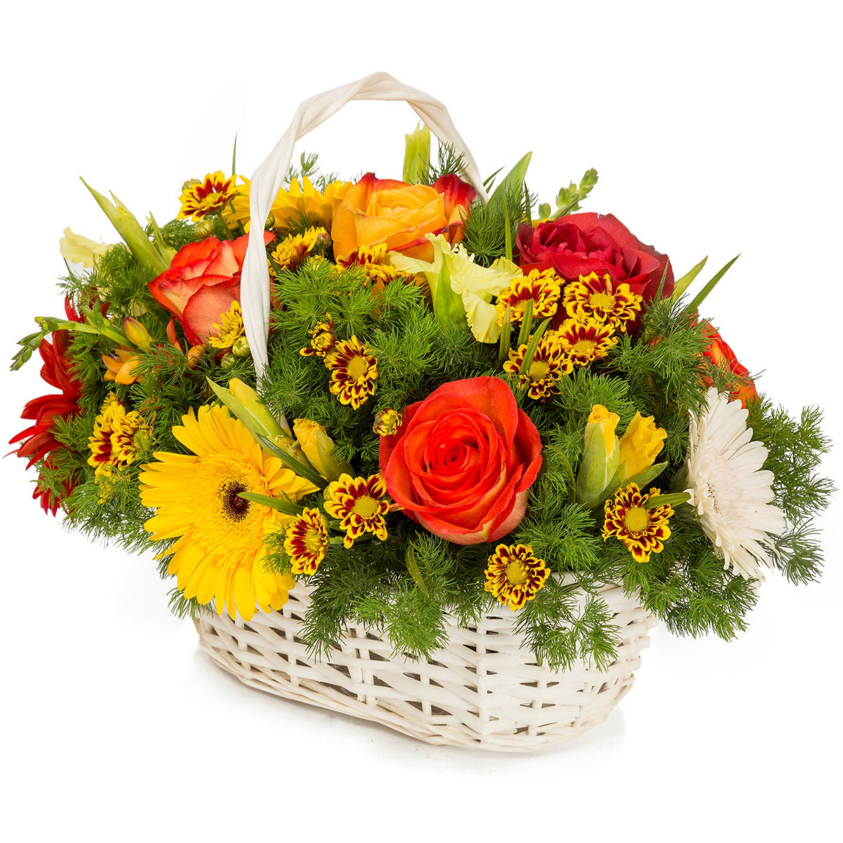 Яркая композиция из оранжевых роз, желтых и красных гербер, кустовых хризантем и гладиолусов создает атмосферу радости и тепла. Плетёная корзина белого цвета добавляет элегантности и стиля. Возможны альтернативы оформления: корзина из лозы или с тканевой отделкой. Прекрасный подарок для любимой на день рождения или юбилей.