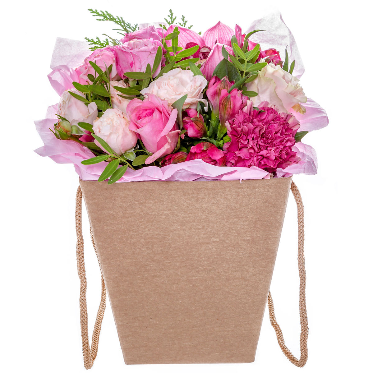 | Состав: | Розы, Альстромерии, Гвоздики, Орхидеи, Пионы |