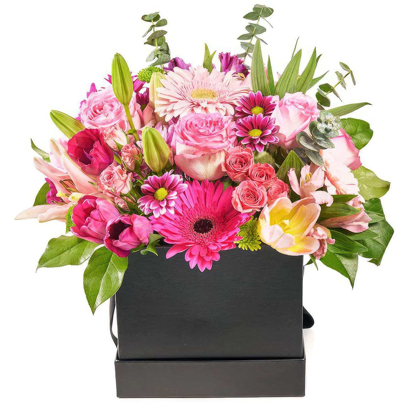 Роскошная композиция из розовых гербер, тюльпанов и лилий, дополненная кустовыми и одноголовыми розами, сиреневыми и зелеными хризантемами, а также альстромерией и эвкалиптом. Все цветы собраны в элегантной черной квадратной коробке, создавая неповторимый стиль. Возможны альтернативы оформления в бархатной или атласной коробке. Идеально подойдет для поздравления любимой на день рождения или 8 марта.