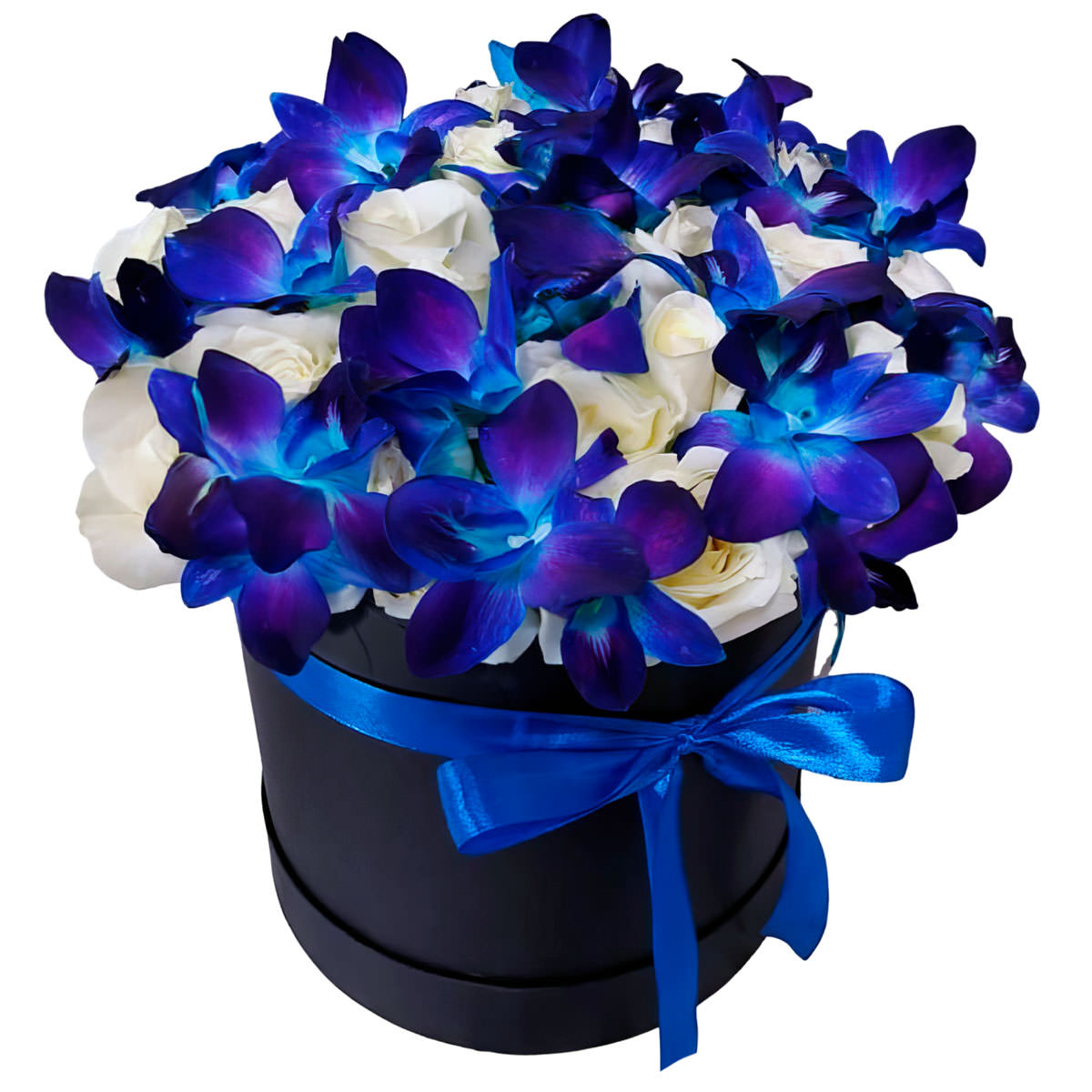 Эта изысканная цветочная композиция сочетает в себе синие дендробиумы и белые розы, создавая контраст и гармонию. Цветы оформлены в элегантной шляпной коробке, украшенной синей атласной лентой. Альтернативные варианты упаковки: бархатная коробка или коробка с принтом. Подходит для подарка на годовщину или для любимой.
