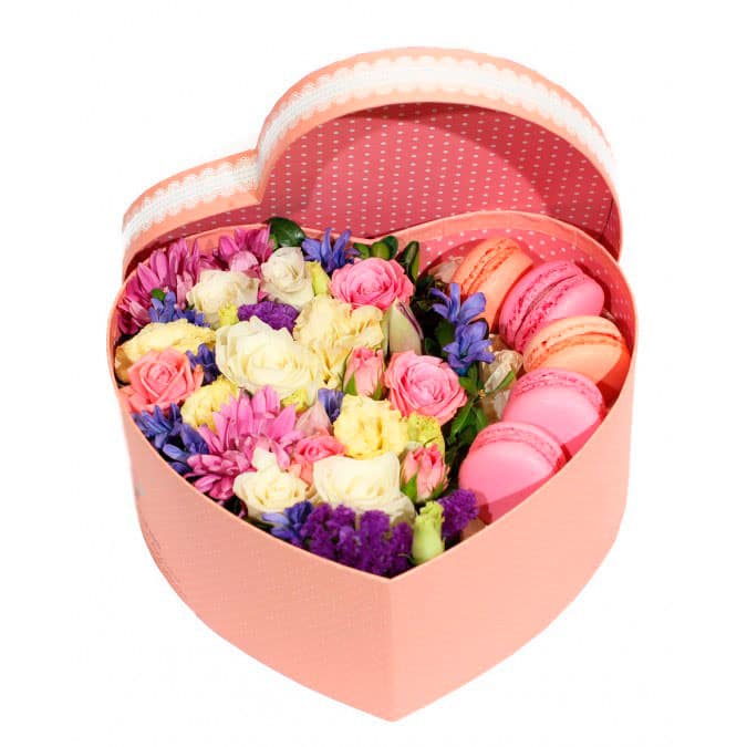 Очаровательная композиция из кустовых роз кремовых и розовых оттенков, сиреневых хризантем и статицы создаёт нежное настроение. Цветы расположены в коробке в форме сердца, дополненной макарунс, что придаёт особую изысканность. Возможны варианты оформления в бархатной или атласной коробке. Прекрасный подарок для любимой на 14 февраля или день рождения.