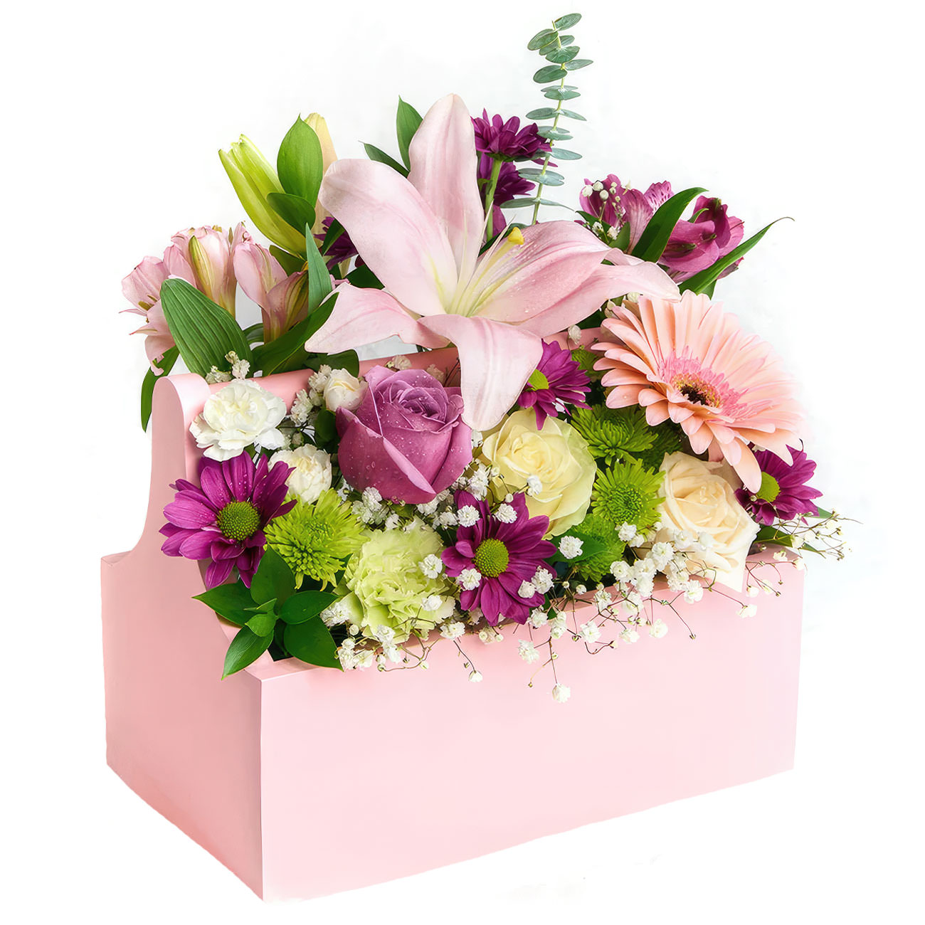 Розовые лилии и герберы, сиреневые и белые розы, а также кустовые хризантемы создают гармоничную композицию. Корзина выполнена в нежно-розовом цвете, добавляя изысканности. Альтернативно можно оформить в корзине из ротанга или с тканевой отделкой. Отличный подарок для любимой на годовщину или день рождения.